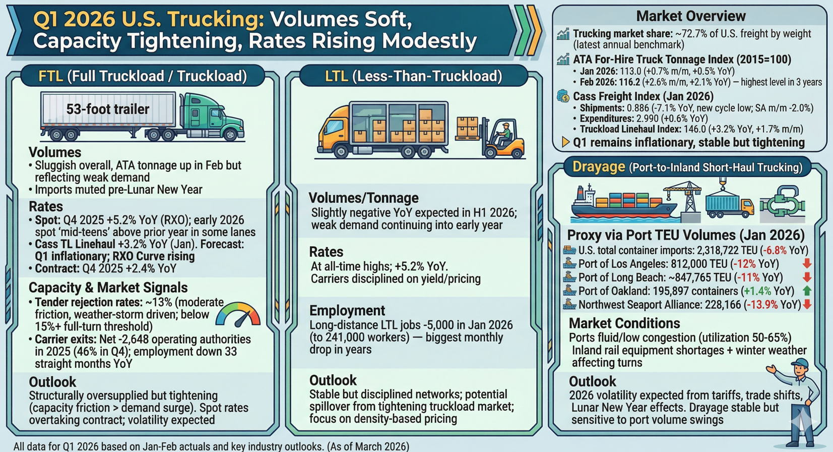 Drayage Outlook: While currently stable, 2026 volatility is expected. Ongoing shifts in trade policy, potential new tariffs, and the lingering effects of the Lunar New Year slowdown (factored into Feb-Mar results) will keep this market sensitive to port volume swings.